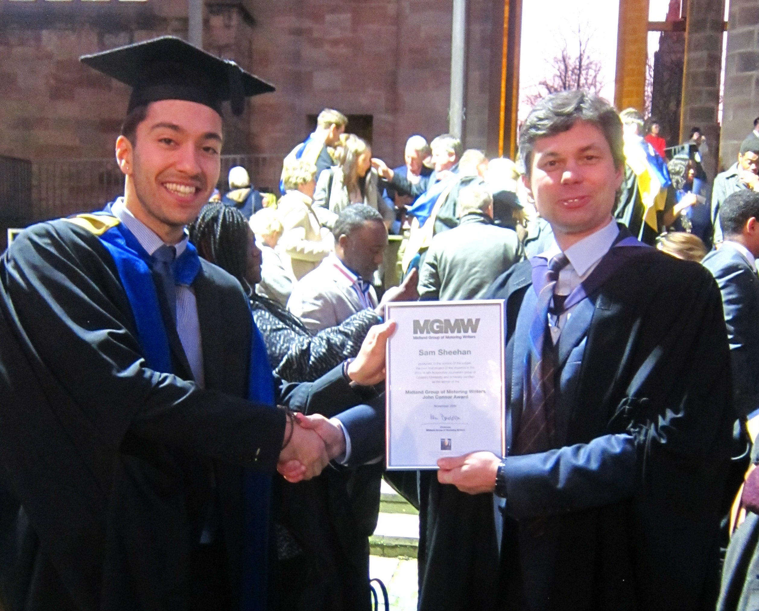 Sam Sheehan is pictured collecting the MGMW John Connor Award certificate from MGMW committee member Andrew Noakes outside Coventry Cathedral.